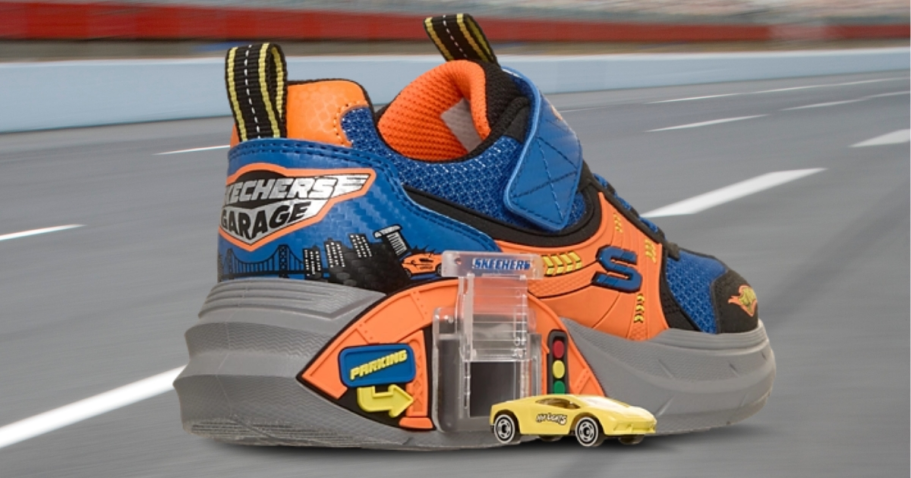 Race over to Kids Foot Locker to grab these trendy, new Kids Skechers Garage Shoes – they have a garage with a toy car in the sole!