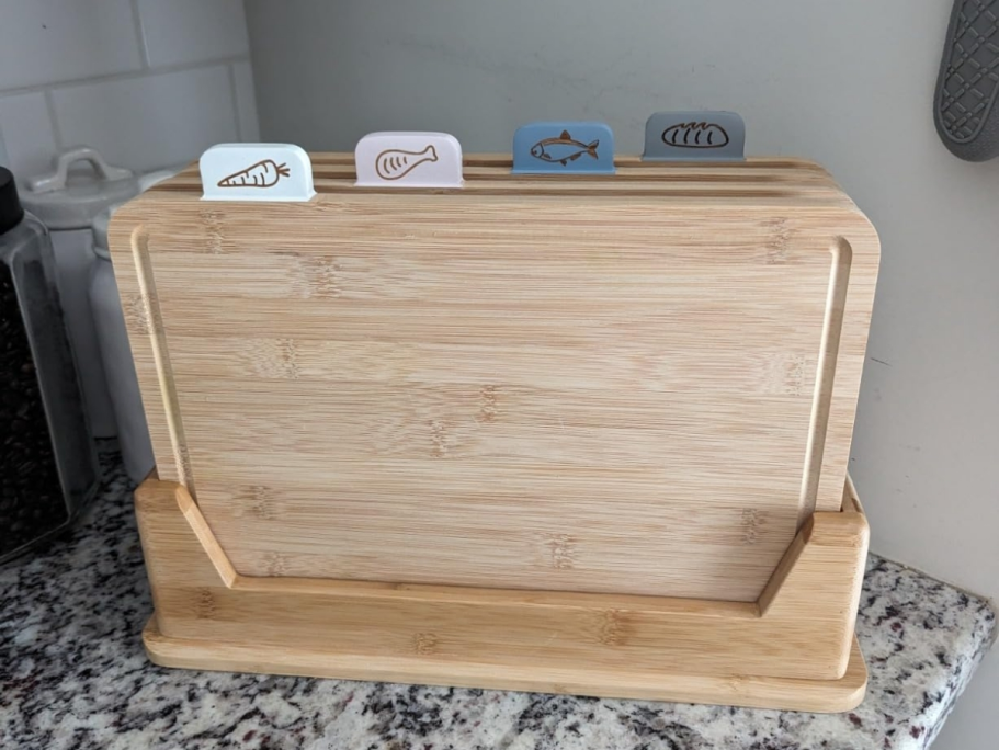 This set comes with 4 cutting boards with food icons to avoid contamination and a holder to keep them all in one place.